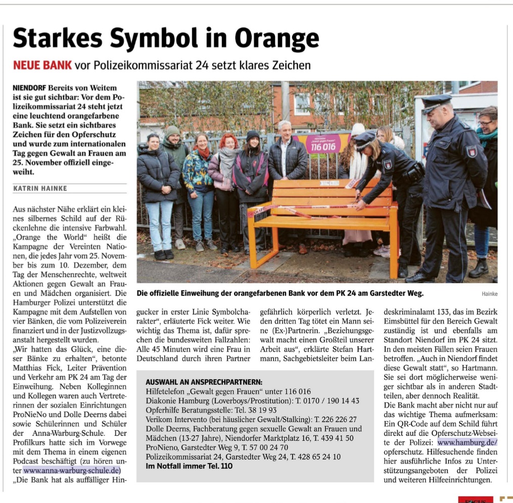 Der Profilkurs E3_23.2 war am internationalen Tag gegen Gewalt an Frauen zu Besuch bei dem Polizeikommisariat 24 in Niendorf. Hier wurde die orange Bank eingeweiht, welche nun vor dem Polizeikommisariat steht. Die Bank ist ein Zeichen für den Opferschutz und wurde am 25.11. offiziell eingeweiht. Alles weitere ist in dem Artikel aus dem Niendorfer Wochenblatt zu lesen! Den angesprochenen Podcast finden Sie hier verlinkt.
